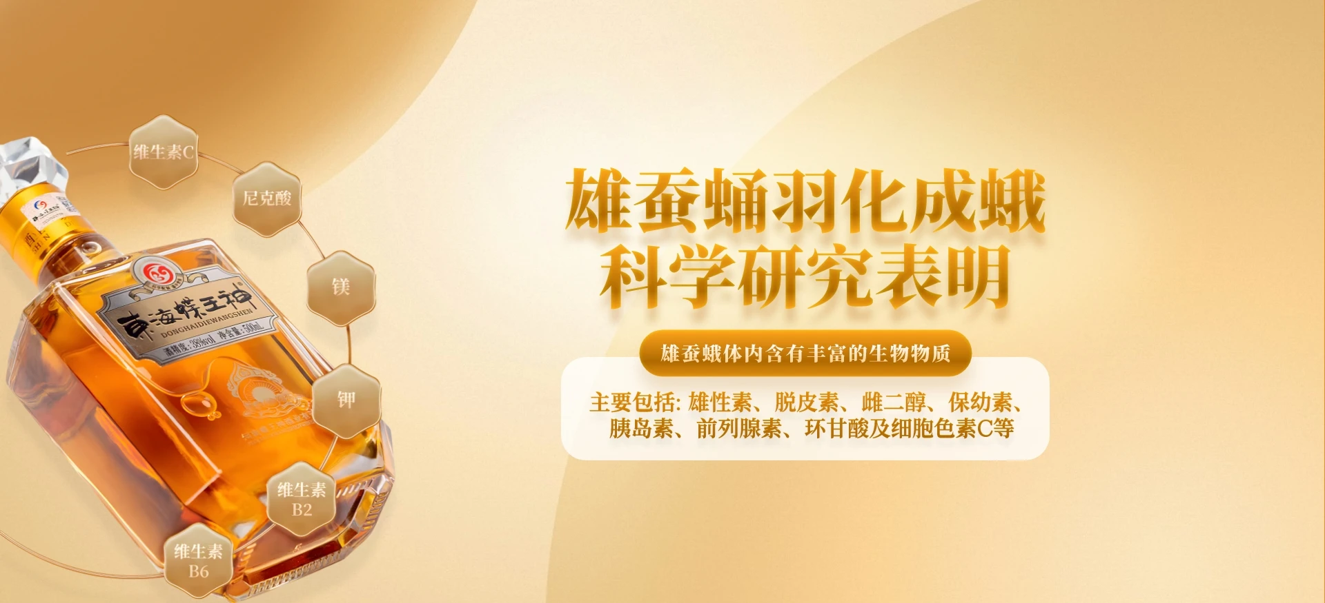 本草纲目记载:雄蚕蛾,性味咸、温,入肝经、肾经。蚕者,天虫也,固有“神虫国宝”之称。在中国传统文化中,蚕被敬称为“天虫”几与龙相似。“蚕与龙同气、龙与马同气,故为龙身、马头者,故此又将蚕称为‘天驷龙精’”。雄蚕蛹羽化成蛾科学研究表明——雄蚕蛾体内含有丰富的生物物质(主要包括:雄性素、脱皮素、雌二醇、保幼素、胰岛素、前列腺素、环甘酸及细胞色素C等。) 经河南省食品检验研究院检测,蝶王神酒含有钾、镁、钙、锌、烟酸、维生素C、维生素B2、维生素B6多种微量元素。