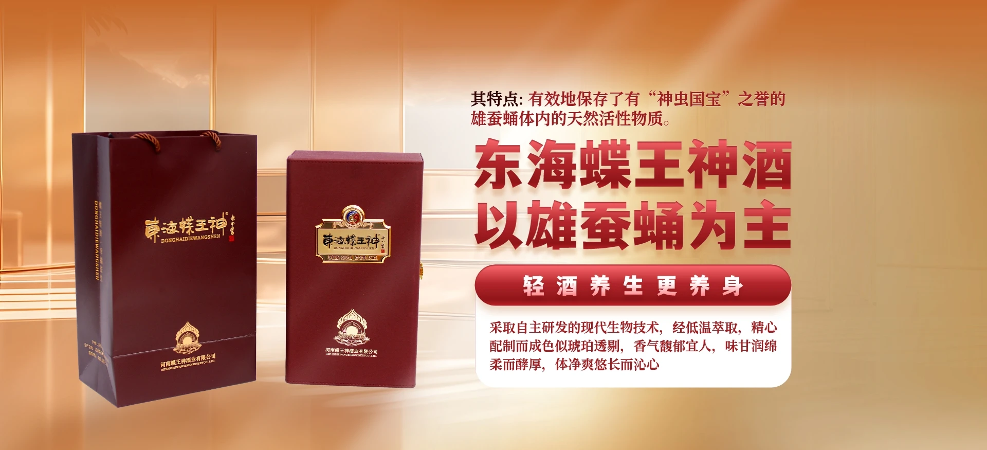 河南蝶王神酒业位于美丽的鹰城一一平顶山市;生产研发基地座落于美丽的白龟湖国家城市湿地公园湖畔。我们的主打产品——东海蝶王神:由被誉为“神虫国宝,天驷龙精”之称的雄蚕蛹为主原料浸泡,经低温萃取而成。蝶王神酒于上世纪九十年代初,由白酒专家依据“药食同源”“食养结合”的原理、花费大量心血研制而成,蝶王神酒一经问世,便得到了国家营养学家于若木女士和白酒泰斗秦含章先生的充分肯定和高度评价。为了适应健康新时代的口感,蝶王神酒在原生产工艺的基础上进一步升级优化,无论是色泽、口感等都更胜一筹。升级后酒液呈金珀色,清亮透明,口感柔和,诸味协调等特点备受青睐。